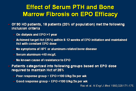 The first issue we are going to talk about is bone disease. This is a study that was done by Rao in 1993, but I like the way that he did it. He took patients of his that had been on dialysis for over a year, and they had been on EPO over a year, and looked like that they had gotten in their target range in a reasonable amount of time, they had been maintained with a reasonably stable dose of EPO. No symptoms of hyperparathyroid disease or aluminum-related bone disease. Serum aluminums were fine, and there was no known cause for any EPO resistance. Then he separated them. He put the poor response group for those who had big doses of EPO, above 100 units per kilogram per week at 3 times a week and then the good response group was less than that.