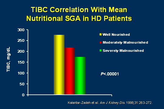 - Kalantar-Zadeh K, Kleiner M, Dunne E, Ahern K, Nelson M, Koslowe R, Luft FC. Total iron-binding capacity-estimated transferrin correlates with the nutritional subjective global assessment in hemodialysis patients. Am J Kidney Dis. 1998 Feb;31(2):263-72.