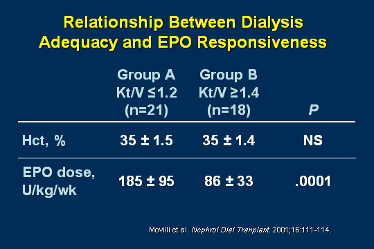 This is the slide that should have followed the bone slides. You can see that that held true. Group A, which was the group that had the big doses of EPO, requiring 185 units/kg/week. They were the patients who had the low Kt/V. It took 185 units/kg/week of EPO to get the same response as a much lower EPO dose in patients who had good dialysis adequacy. This was the study by Movilli where they looked at what your adequacy was, what your Kt/V was. The ones who were poorly dialyzed or did not meet adequacy targets used more than twice the amount of EPO per treatment than the group B, which was well dialyzed. If you are looking at what is going on with your patients and how much EPO you are using, this would be another way to look at, "If I treated these patients with iron, do they need it or do they not?" Also, if can I improve their dialysis adequacy? So looking at access and other things can improve your outcomes.