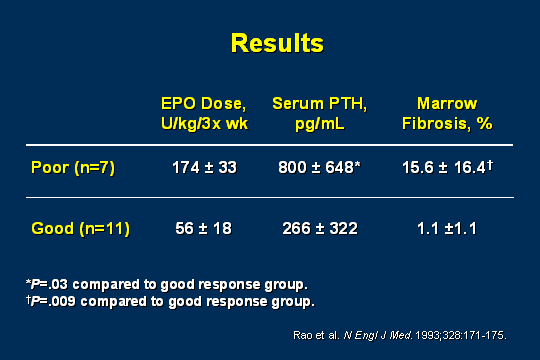 - Rao DS, Shih MS, Mohini R. Effect of serum parathyroid hormone and bone marrow fibrosis on the response to erythropoietin in uremia. N Engl J Med. 1993 Jan 21;328(3):171-5.