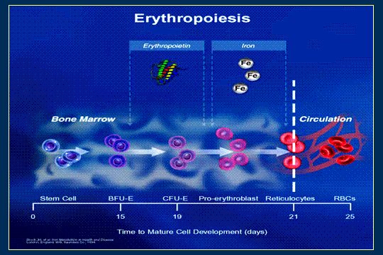 Starting out with erythropoiesis - and we cannot use pointers because I am not very good like this or I would be working at the airport - If you look across the top, you see EPO and iron and that is where those things fit in. We are going to talk about it as we go, but those are the 2 big barriers, having the balance that we are going to talk about today in EPO and in iron. Imagine yourself, you are a stem cell. You are in the bone marrow and you want to grow up and be a red blood cell. It is going to take you 25 days to get down in circulation when you look down at the horizontal bar at the bottom. You come out as a reticulocyte. We are going to talk about that in a second. But look down there at the timing. I do not even care if you remember what these stand for, but that is a blast-forming unit. About that time, that is when the EPO receptors actually come around the cell, and they protect the cell, and they are like Bob Barker's show, "Come on down." They want the EPO to come on down and be incorporated into the cell so the cell can mature. Then around 19 to 20 days, it changes, and there are more transferrin receptors around the cells, and it is doing the same thing to the iron and it is saying, "Come on down," so that it can incorporate iron into the cell. The interesting thing is that if you do not have iron there then, you cannot put in later, so it is important that it is there at that time, and we have to think that everyday is a day 19 to 20 to a cell or a number of cells in the body and that is why it is so important to have maintenance iron. It is interesting because as I understand it, the new K/DOQI guidelines are going to be silent on repletion but maintenance is just iron therapy and it does not give you all the repletion things that we had in the last guidelines. Day 21, the cell comes out and says, "Boy, I am a reticulocyte!" but it takes another 4 days for it to be a red blood cell.