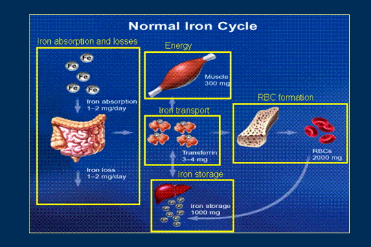 Let us take a look at the normal iron cycle. Iron is pretty well balanced in the body. You lose 1-2 mg a day. You absorb 1-2 mg in the gut; you lose 1-2 mg in the gut. Then you have transferrin. I look at transferrin as like the iron taxi. It actually is a protein and what it does is it picks up 2 iron molecules and takes it wherever it wants to go, and it can make about 10 trips a day. It is taking the iron to storage to wherever the need is and then we have about a third of the iron or a fourth of the iron in storage in the liver and some other tissues. We have about two-thirds or three-fourths of it that is actively in red blood cells or in the RE system and then we have a very small amount in the muscle from myoglobin and other enzymes. Go back and look at transferrin because I did not make a point that I wanted to. Look how much iron is in transferrin, precious little, 3-4 mg.