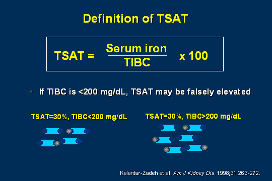 I did not know this until I started talking for what seems like eons ago, but it was just a little over a year, that TIBC - total iron-binding capacity - is actually a surrogate marker for transferrin. When we look at transferrin saturation, you can see that the equation here that your TIBC is the denominator and what we found is that if that TIBC is low, which is under 200, then your transferrin saturation may be falsely high. When I am trending iron and looking at the sheets that the anemia manager brings me, then one of the things I always look at is what is that TIBC and if it is below 200, then I think, well my TSAT may not be reliable. If it is above 200, I take the TSAT at face value. You can see from the cartoon down there that the serum that has a low TIBC has less iron in it than the serum that has a TIBC above 200.