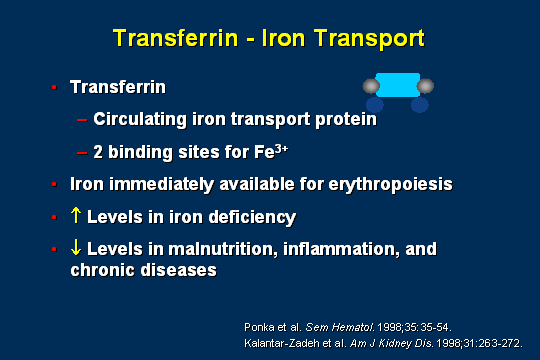 To simplify things, and there are a lot of issues, but they are not simple - Obviously, if the doctors are fussing and going on and arguing about it, there is always more to the story - but we can look at this simplistically as transferrin being the circulating iron transport protein - remember, a protein, and we are going to talk about malnutrition - and it has the 2 iron binding sites; so that iron is immediately available. When you give especially the new iron agents that have very good bioavailability, even in small doses, if your ferritins are high, then that iron is immediately available for the body to use. Serum transferrin is generally elevated because you need more taxis if you have iron deficiency, but in the presence especially of malnutrition, inflammation, and chronic disease, transferrin is low. Most of our patients have malnutrition, inflammation, and chronic disease. So, we really need to be looking at it patient by patient and that is my take-home message for all day. In case you miss it, I will tell you again.