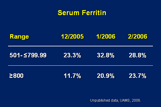 I looked at our serum ferritins because I wanted to see how many of my patients in my unit had ferritins above 500, and I encourage all of you to do this, too. If your ferritins are above 800, which is what we have been looking at, you can see in my unit that anywhere from around 12% to almost 24% in this 3-month period were above 800, and I have a very novice anemia manager who is missing tweaking iron, but even when I look at it sporadically, it is somewhere in that neighborhood, usually more in the 20% range, so December was an unusual month; but that is what you want to look at in your protocols. If you have somewhere in the 10% to 20% that fall out of your protocol, those are the patients who you say, okay I need to take a closer look. When you add in all of those patients who are above 500, that takes me up to about 50 patients a month that I am supposed to look at, and I think that that is a little unreasonable on a monthly basis, but I think we ought to do it at least once. I think we need to look at those patients, see what their ferritins are, see if they live there, talk to them: Is there something that you can do?