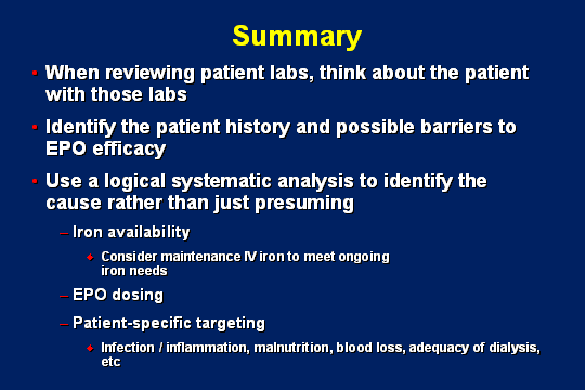 In summary, when you look at those labs, do not just look at labs. Think about the person that is behind that lab. Identify that patient history, get to know it, look at what the possible barriers to EPO efficiency are, use a systematic logical thought process in what you are doing. I hope that I have added some pearls to what you are looking at. Look at iron availability. Did you hold the iron for some reason, and you have not started it? I give little small doses, 31.25 mg of iron and that is kind of my low dose, 31.25 once a week. I have tried other things, and we can talk about it in the question and answer period, but that tends to work out best for us. Some people do not like to do that because you are using 2 doses out of 1 vial and so for those people 62.5 mg every other week may be preferable; and then I go up from there. Occasionally, I have to go down in dose - our patients are individuals. We should expect that we cannot have everybody on the same dose. Also, look at your EPO dosing and go in there and actually look at the patients who are using big, big doses of EPO, and see if you are treating those people with iron appropriately. Then look at those patient-specific targets that we looked at before.