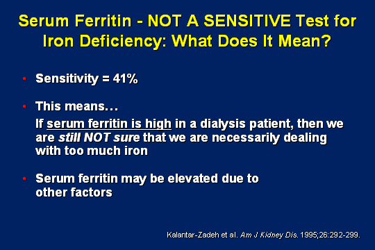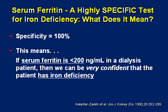 But, it is not that sensitive. Only 41% sensitivity, and it is because when it is high, we do not know if it is because you are iron replete or if there are non-iron reasons, and I hope that you have understood that we have lots of patients who have a lot of reasons to have problems with serum ferritins and low transferrins.
