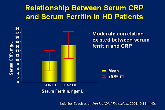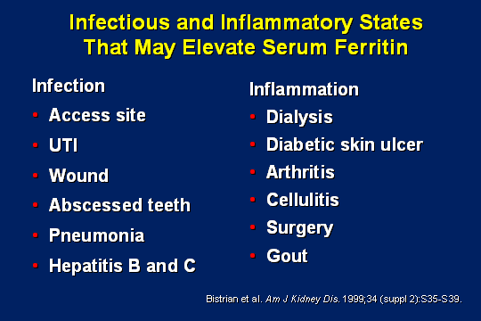 - Kalantar-Zadeh K, Rodriguez RA, Humphreys MH. Association between serum ferritin and measures of inflammation, nutrition and iron in haemodialysis patients. Nephrol Dial Transplant. 2004 Jan;19(1):141-9.