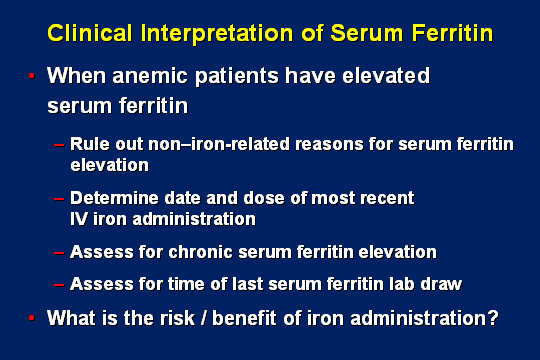 When you are looking at patients who have elevated serum ferritins the big thing is to rule out do they have an active infection? I always think back of those days when we were using DFO, and you know we were chelating iron in our sickle cell anemia patients and our patients who were getting gobs of transfusions. That particular set of patients would get these just gosh awful fungal infections, because some bacteria and fungus love iron-rich blood and that is the reason, if you are giving iron and someone has an active infection, what the transferrin is supposed to do is take it and put it in storage as a protective mechanism, and that is called inflammatory iron block. You always want to rule out active infection. You look and see when you gave your last dose of IV iron. If you gave it on Monday and you checked your iron on Wednesday, maybe it was your dose of iron that created a problem. Look and see. Does the patient live there? Those of you all that heard me speak in Kansas City know that I have patients, I looked at my patients, had about 20% of them that fell out in that 800+ ferritin but 50% of that 20% kind of lived there. They ran between 800 and 1000, sometimes a little over and sometimes a little under but that was just their normal. They had some underlying something that caused that ferritin to be up. If we can dig in and find out what that is that is great because maybe we can help them but holding iron is not going to be one of those things that probably does. Then, you look at the last time you drew your serum ferritin. Again that keys in with your dosing. You have to weigh what is the risk and what is the benefit of giving that iron dose. We want to do no harm but we want the patient to receive the benefit of iron if they need to have it.