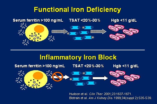 How do you judge this? Remember functional deficiency is when, for whatever reasons, a patient is just not mobilizing iron. It is not bioavailable to meet the needs of that particular patient. Then inflammatory iron block is what I just described. There is an infection and the transferrin is taking the iron into storage.