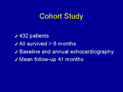 Now, in addition, at baseline all the patients had an echocardiogram. This was repeated annually for the rest of their life on dialysis. We have very compliant patients, which reflects that the weather is so bad- -our patients have nothing better to do than to go for echocardiograms post-dialysis. I think there is something to be said for bad weather. As you can see, our mean follow up is quite long. This is the principle strength of this study, that it collects data over a long period of time. The three centers involved were two in St. John's--Newfoundland and one in Montreal, in Quebec.