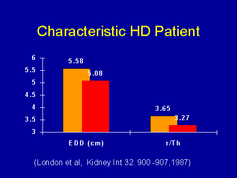 Dialysis physicians have known for years that our patients have big hearts. So if you go on and do chest x-rays, on average the cardiothoracic ratio (r/Th) is larger than age-matched controls. This is a classic study from a group in Paris from 1987. This group looked at hemodialysis patients. They wanted to be able to separate the non-hypertension and non-ischemic heart related effects out of the picture. They simply excluded the patients with hypertension and a history of myocardial infarction or angina. They looked at the echocardiograms of their patients and compared them to age-matched controls. What they found was that on average the hemodialysis patients, here, had left ventricular dilatation which was more than the general population had. When they looked at associations, they found that the things that were associated with degree of dilatation--anemia, AV fistula, and chronic inter- dialytic excess fluids--these were the factors that were associated. So, again, I suppose that none of this is too surprising.