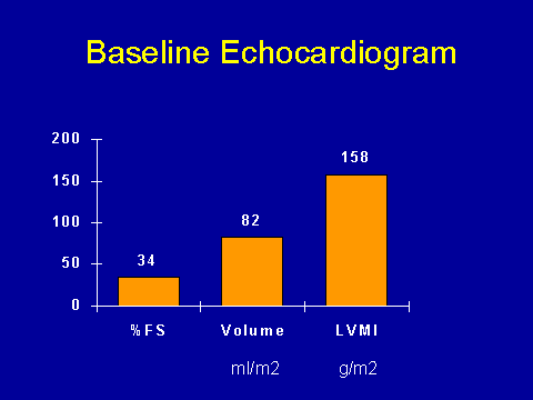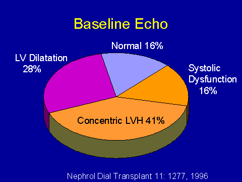 (Foley RN et al. Kidney Int 1995; 47:186-192)In our study, we found that the mean left ventricular mass index was 158 grams per meter squared. The cavity volume was 82 mls per meter squared; fractional shortening, 34 percent. These figures probably don't mean a whole lot to you. In the Frammingham Study, the upper limit of normal for a male is about 130 grams per meter squared; for a female, the upper limit of normal is about 100. Cavity volume is said to be less than 90, and fractional shortening depends upon several factors so there aren't good norms for that.