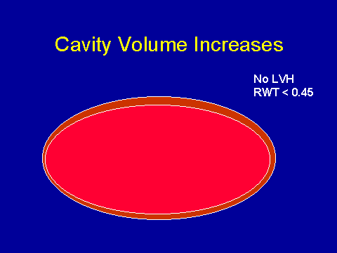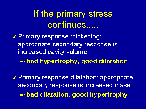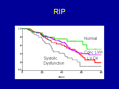 (Foley RN et al. J Am Soc Nephrol 1995; 5:2024-2031.)In other words, there is good hypertrophy in this situation. Conversely if you've got a problem where it is mostly a thickening phenomenon as opposed to dilatation, maybe you have uncontrolled hypertension or aortic stenosis, you could imagine that a little bit of dilatation would be good for you in terms of wall tension. Just to confuse you even more, you could imagine that if your primary problem is thickening, say you've got this hypertensive cardiomyopathy--the hypertrophy is bad but a bit of dilatation could be good. If you flick over to the people who have dilatation, you could imagine "bad" dilatation and good hypertrophy.