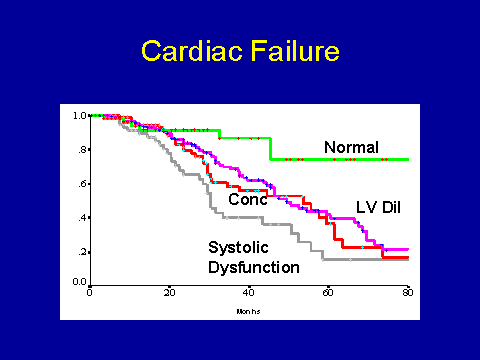 In terms of prognosis, what do these things mean? So what I've got here is the time to first onset of cardiac failure according to the baseline echocardiogram. I would just emphasize that we've excluded patients who had cardiac failure at baseline. You can appreciate that you're a lot better off if your left ventricle is relatively normal when you start. The worst prognosis, as you would expect, is systolic dysfunction. You find that concentric hypertrophy and LV dilatation have an intermediate prognosis in terms of cardiac failure. If you do a similar-type of analysis for new onset ischemic heart disease defined clinically, you get an identical, superimposable picture.