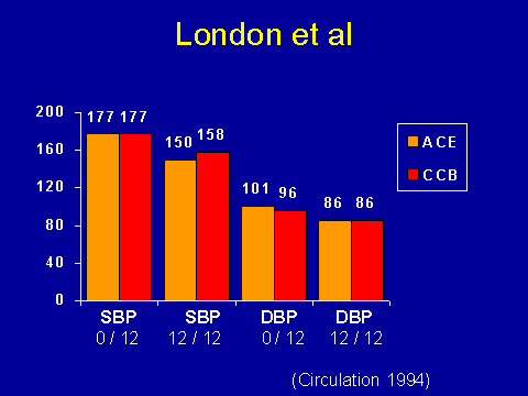 (London GM et al. Circulation 1994; 90:2786-2796.)Again this is from the Paris group. They selected out patients who had uncontrolled hypertension who didn't have ischemic heart disease. These are hemodialysis patients. They simply randomized them to an ACE inhibitor and a calcium channel blocker. They followed them over time. In terms of systolic and diastolic blood pressures, they achieved almost identical blood pressures.
