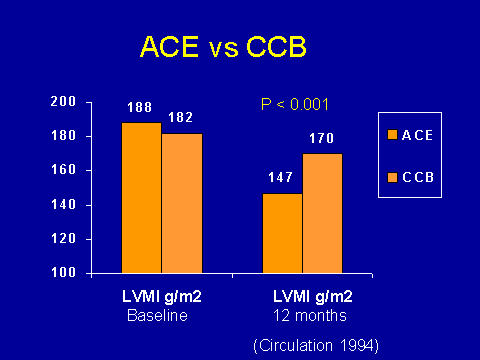 (London GM et al. Circulation 1994; 90:2786-2796.)However, when they looked at left ventricular mass index 12 months down the road, they found that the ACE inhibitor group did significantly better in terms of mass. Now this, again, is a proximate outcome; it's not mortality data. It is a pretty suggestive study all the same, which probably needs to be replicated.