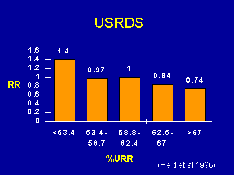 The other big factor that you see cropping up all the time in the literature is intensive dialysis. You've actually seen this slide this morning. It shows that your adjusted mortality goes up as your urea reduction falls. Again, lots of investigators have shown this, so it's pretty well accepted.