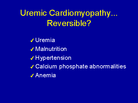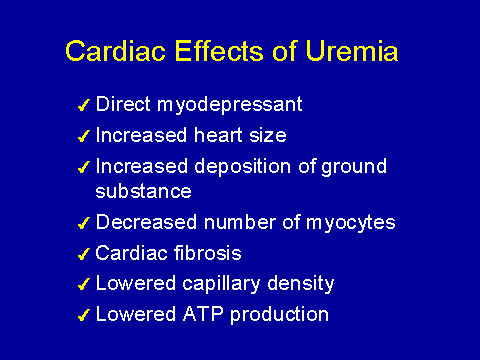If you go to the animal literature, you find that uremia has fairly pronounced effects on cardiomyopathy, it's a direct myosuppressant--it increases heart size, independently of blood pressure; it causes deposition of ground substance; it kills off myocytes; it causes lower capillary density; and it lowers ATP production. So it seems to be a pretty bad package all around.