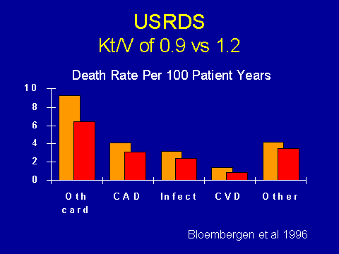 (Bloembergen W et al. Kidney Int 1996; 50:557-565.)Surprisingly little has been written about the influence of dialysis intensity and cardiac outcomes. This, again, is data from the USRDS. They are comparing people with relatively poor Kt/V to those with an adequate Kt/V. You find that cardiac deaths are more common in patients with a low Kt/V. This is the best clinical evidence that we have that uremia is bad for the heart, per se.