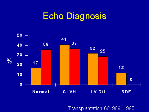 A convenient natural experiment to look at the effect of uremia on cardiomyopathy is to look at people pre- and post- transplant. If you look at the natural history of your typical dialysis patient in terms of echocardiograms, if they stay on dialysis, their echoes stay bad, basically. However, if you look at echoes pre- and post-transplant, you see dramatic differences. We had 100 patients who had an echo within a year of transplantation and more than a year after it. There were pretty profound differences in the echocardiograms pre- and post-transplant. The percentage who ended up having a normal echocardiogram, while nowhere near acceptable, it still was approximately double. The percentage with concentric hypertrophy, about the same: Significantly less LV dilatation but dramatically less systolic dysfunction. So these were patients who might have been not allowed to have transplantation in some institutions. They all had normal coronary arteries as well. But it is a dramatic result.
