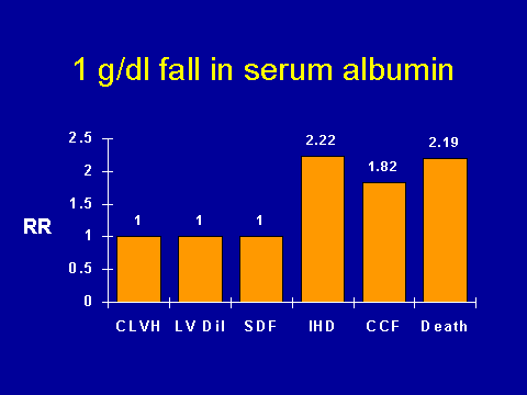 Another interesting finding in this study was the association between low serum albumin and cardiac events. Again, if you're a simple-minded person, this shouldn't be unexpected because of all the variables that have been associated with mortality in dialysis patients, this is probably the most consistent. This is within hemo and peritoneal dialysis patients. So again, we looked at serum albumins prospectively and asked if there was a correlation with cardiac outcomes? In terms of the progression of the cardiomyopathy, there wasn't really a lot of association between a fall in serum albumin and progressive concentric hypertrophy. There was a tendency toward more dilatation if your serum albumin fell. There was a very strong association with new onset ischemic heart disease (IHD) and cardiac failure (CCF) and death. These data are very suggestive that whatever serum albumin is marking for; i.e., that it's mediating some of its bad effects via cardiomyopathy. The million dollar question is: How? I actually can't tell you, believe it or not.