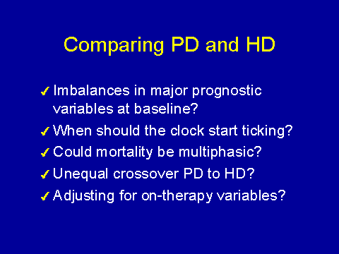 One of the more disturbing findings in our study was the disparity in outcome between hemodialysis and peritoneal dialysis patients. So where I live there are a lot of people who live quite a distance away from the institution. We actually do more peritoneal dialysis than hemodialysis. Comparing hemodialysis and peritoneal dialysis patients in terms of mortality is a nightmare because there tends to be an imbalance in major prognostic variables. There is this question about when should the clock start ticking? So, in our study remember that we only looked at patients who survived for six months. There is this question about could there be a multiphasic mortality pattern? You need very long follow up to be able to really give a meaningful answer. Then there is this major problem of crossover between PD and hemo, and how would you analyze that? Having said that, when we looked at the outcomes, there seemed to be a clear disparity favoring hemodialysis, which came into effect at about two years. Serum albumin was the biggest prognostic indicator of this discrepancy. Again, this is worrying data which needs to be confirmed.