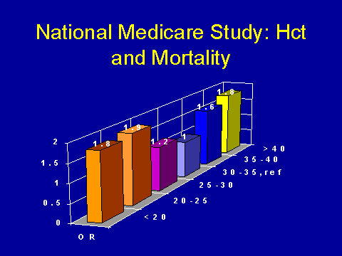 (Lowrie et al. Am J Kidney Dis 1995; 220-228.)This is a study, again it's from Lowrie et. al., and they look at mortality adjusted according to hematocrit. Again, they have what appears to be a U curve. So as your hematocrit drops below 30%, your chances of dying go up pretty dramatically. Worryingly, as your hematocrit rises beyond 35 percent, mortality appears to go up. Again, this is a cautionary note.
