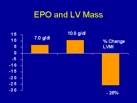(Muirhead N et al. Am J Kidney Dis 1995; 26(2 Suppl 1): S1-S24.)So this is very consistent with the idea that anemia leads to cardiomyopathy, which leads on to cardiac failure, which leads on to death. This is one of the few things that we can clearly do a lot about. There have been several studies looking at partial normalization of anemia and LV mass. Now, in general, these studies are poor because they don't have a control group so they are just pre- and post-. But the data are very consistent across studies. So if you pooled the studies and you look at percent change of mass index, as you go from an average of 70 (g/L Hgb) before they started treating to 108 (g/L Hgb), approximately 6 to 9 months after treating, does this change left ventricular mass index? All the studies that were referred to there were done in patients already established on dialysis.